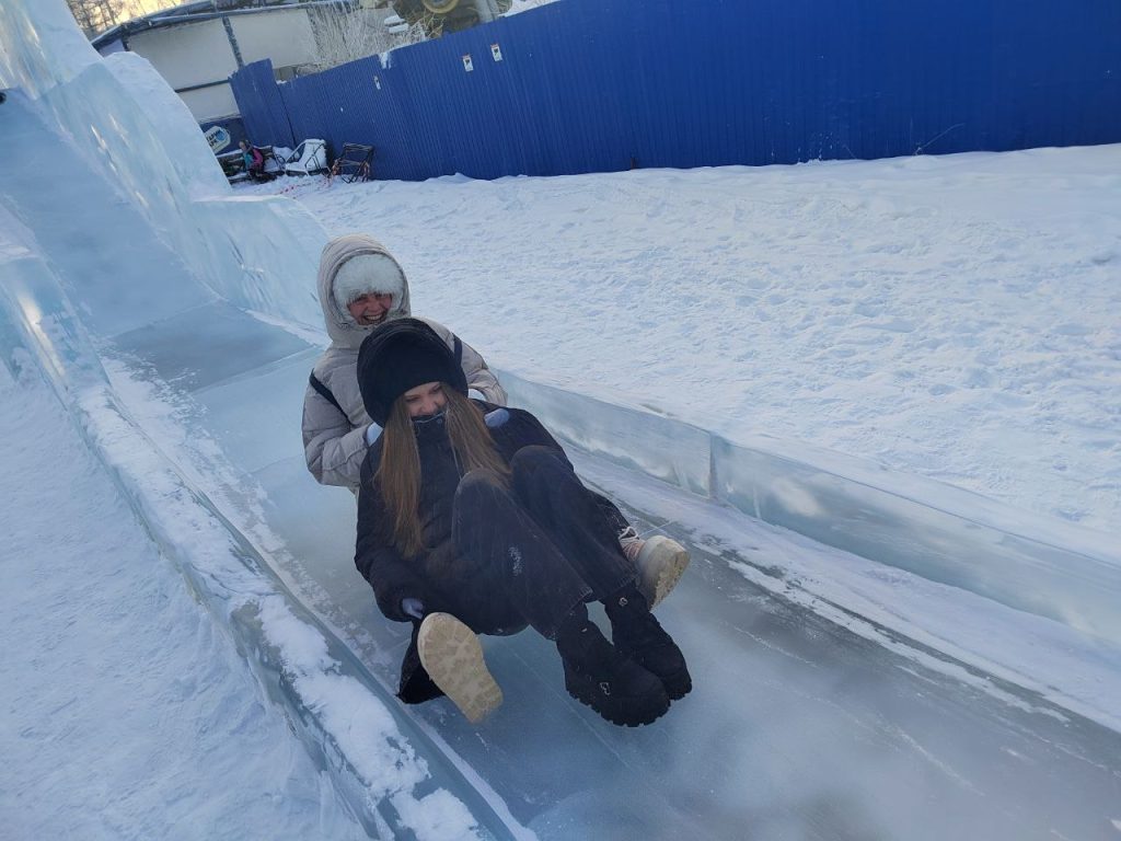 Что может быть лучше, чем с ветерком прокатиться на горках, смеясь и подбадривая друг друга? А потом, немного запыхавшись, полюбоваться на еще нарядную, сияющую елку, которая так и манит своей праздничной атмосферой.